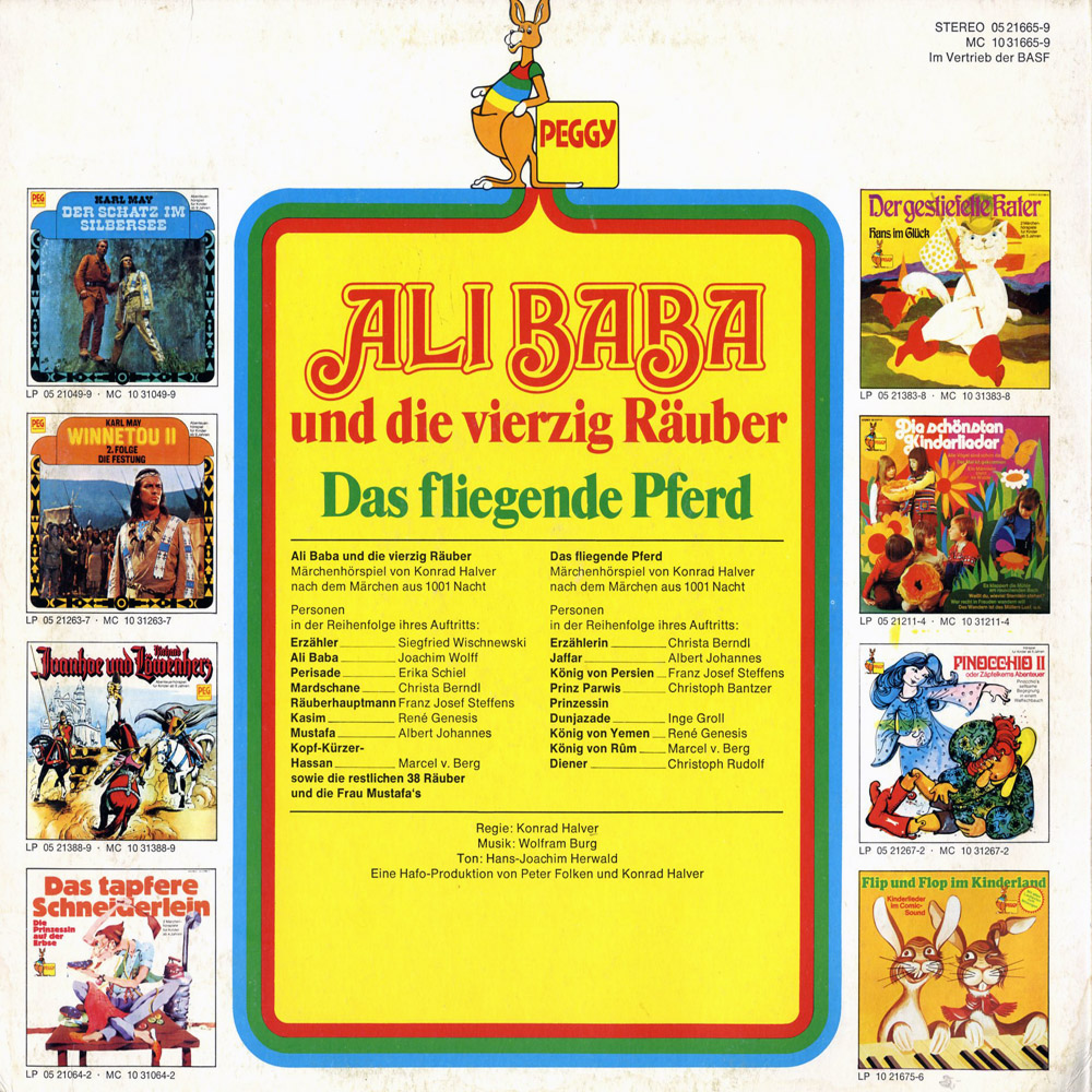 Ist das Cover nicht grossartig? Im Originalformat wirken die vielen Schatztruhen noch verführerischer... Auch der Inhalt kann sich hören lassen. Bei 'Ali Baba' ist Siegfried Wischnewski mit seiner wunderbaren Basstimme der Erzähler, Joachim Wolff präsentiert einen gut gelaunten Ali Baba und F.J. Steffens den Räuberhauptmann. Konrad Halver und Peter Folken (sicher wieder mal die Macher des HSPs) sind in kleinen Räuberrollen zu hören. Beim 'Fliegenden Pferd', das ca. 2/3 der B-Seite einnimmt und aufgrund der Liebesstory sehr romantisch angehaucht ist, wirken einige 'Ali-Baba'-Sprecher erneut mit. Christoph Banzer mimt den Prinzen, Albert Johannes den Schurken. Gesamturteil: Ein Klassiker, den man als Kind gekannt haben sollte.