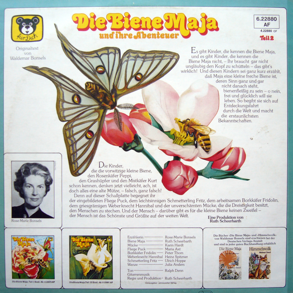 Frau Bonsels selbst hat die Rolle der Erzählerin. Ich gehe davon ausgehen, dass diese Vertonung daher inhaltlich dem Buch näher kommt als die bekannte Fernseh-Maja. Frau Bonsels macht ihre Sache als Erzählerin sehr gut. Die Sätze sind gut betont und die Sprechpausen helfen, die teilweise verschachtelten Sätze zu verstehen.