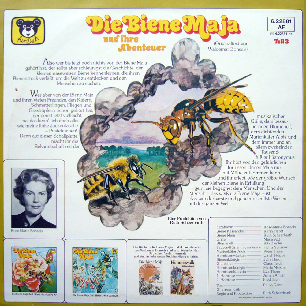 Frau Bonsels selbst hat die Rolle der Erzählerin. Ich gehe davon ausgehen, dass diese Vertonung daher inhaltlich dem Buch näher kommt als die bekannte Fernseh-Maja. Frau Bonsels macht ihre Sache als Erzählerin sehr gut. Die Sätze sind gut betont und die Sprechpausen helfen, die teilweise verschachtelten Sätze zu verstehen.
