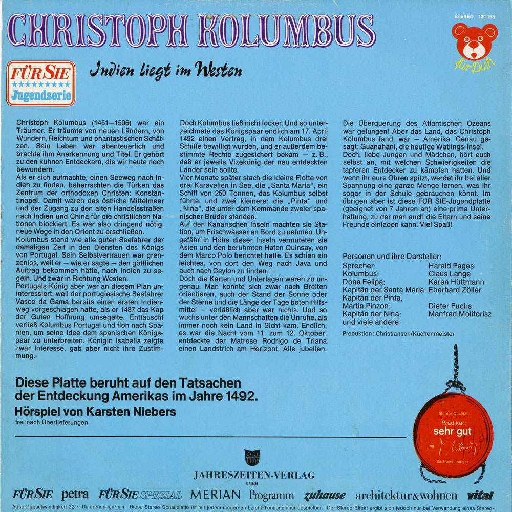 Habe ein Columbus-HSP ganz billig im "Schlecker " in den frühen 90ern erworben von einer Firma " Omniphon". Leider stehen auf dem Cover keine Sprecher, aber die hier aufgeführten Rollen kommen alle vor. Es beginnt mit dem Satz: " Seht Ihr dort das gelbe Holz, Dona Felipa ? Man nennt es Bambus..."