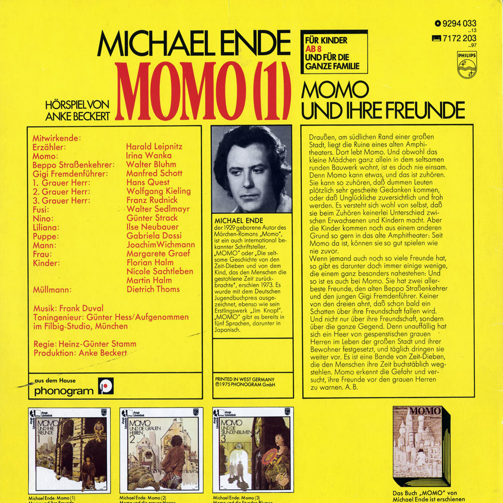 Momo ist als Hörspiel nicht spektakulär, aber ganz textgetreu und auch sonst solide. Und es gibt den Wiedererkennungswert eines "Anke-Beckert"-Hörspiels: Harald Leipnitz als Erzähler, all die anderen Münchner Sprecher und die Musik von Frank Duval...