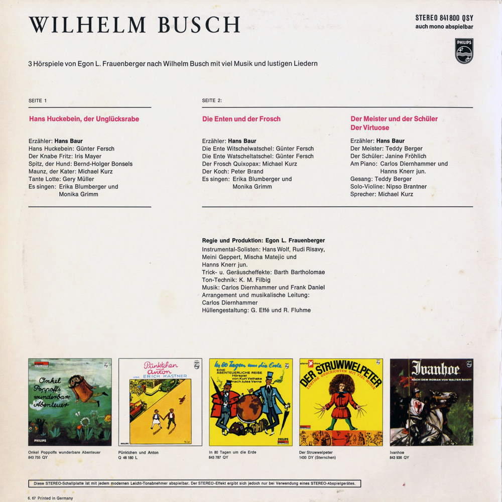 Ich kann Wilhelm Busch auch nicht besonders viel abgewinnen. Weder in Schrift- noch in Tonform. Zugegebenermaßen ist dieses Hörspiel aber eines der Gelungeneren. Hans Baur reißt aber einiges raus.
