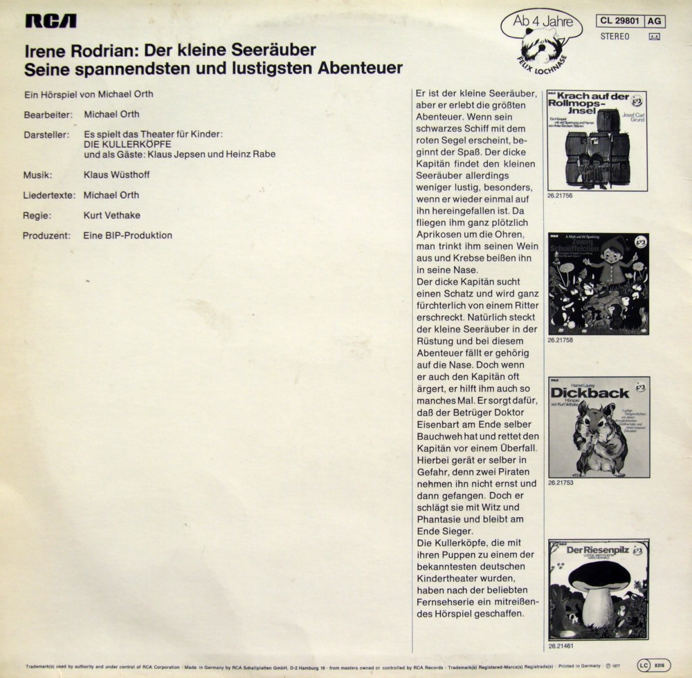 Hört und erlebt mit dem kleinen Seeräuber – wie dem dicken Kapitän die Aprikosen um die Ohren fliegen und er zu einem Schiff voll Marmelade kommt – wie der Betrüger Dr. Eisenbart am Ende selber Bauchweh kriegt – wie der dicke Kapitän einen Schatz sucht und durch Ritter erschreckt wird und wie der kleine Seeräuber in seiner Rüstung auf die Nase fällt...