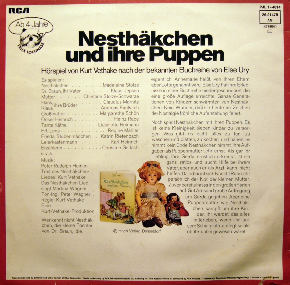 Die hier (oben) angegebenen Sprecherdaten stammen von Folge 2 ("Nesthäkchens erstes Schuljahr"). Habe darum mal von der Plattenhülle die korrekten Sprecherangaben für Folge 1 angeschrieben. Sie unterscheiden sich von denen der zweiten Folge lediglich in den letztgenannten Sprechern.