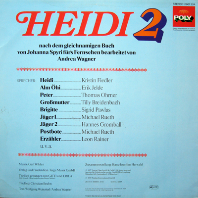 Zusammenstellung von Hans-Joachim Herwald nach dem gleichnamigen Buch von Johanna Spyri fürs Fernsehen bearbeitet von Andrea Wagner Musik: Gert Wilden Titellied: Christian Bruhn Titellied gesungen von Gitti und Erica Text: Wolfgang Weinzierl / Andrea Wagner