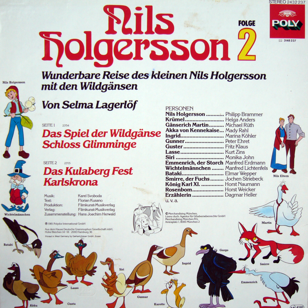 Diese Serie lief damals zu meiner Grundschulzeit und ich erinnere mich, diese Serie auch gesehen zu haben, obwohl mir Eerinnerungen an Einzelfolgen fehlen. Der Zufall brachte mich zu dieser LP bzw. MC und hatte zur Folge, dass ich alle haben musste. Noch vor Heidi ist Nils Holgersson fuer mich der Oberbegriff fuer eine kindergerechte und schoene Kinderserie, die ich jedem nur ans Herz legen kann. Ich musste mir die Serie komplett zulegen und arbeite an der Vervollstaendigung meiner DVD-Sammlung zu dieser Reihe. Ich liebe diese Zeichentrickserie. Volle Punktzahl!!!
