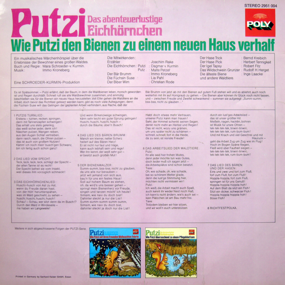 Es ist Spätsommer - Putzi erfährt, daß der Baum, in dem die Waldbienen leben, morsch geworden ist und Regen durchläßt. Schnell ruft sie alle Waldbewohner zusammen, und einmütig beschließen sie, für die Bienen ein neues Haus herzustellen. Voll Eifer gehen die Waldtiere an die Arbeit, doch bevor das Richtfest gefeiert werden kann, gibt es noch viele Aufregungen