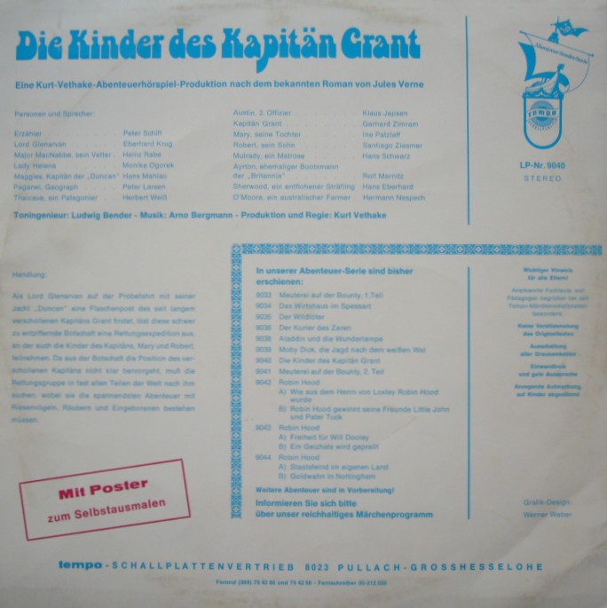 Für mich eines der schönsten Hörspiele von Kurt Vethake und um Längen besser als der Zweiteiler von Europa. Hier stimmt einfach alles: die Musik, die Story, das Timing und vor allem die Besetzung der Rollen. Besonders gelungen finde ich Eberhard Krug als Lord Glenarvan (herrlich affektiert) und Peter Larsen (= Peter Schiff?) als verpeilten Geographen Paganel. Die üblichen Doppelbesetzungen halten sich hier im Rahmen.