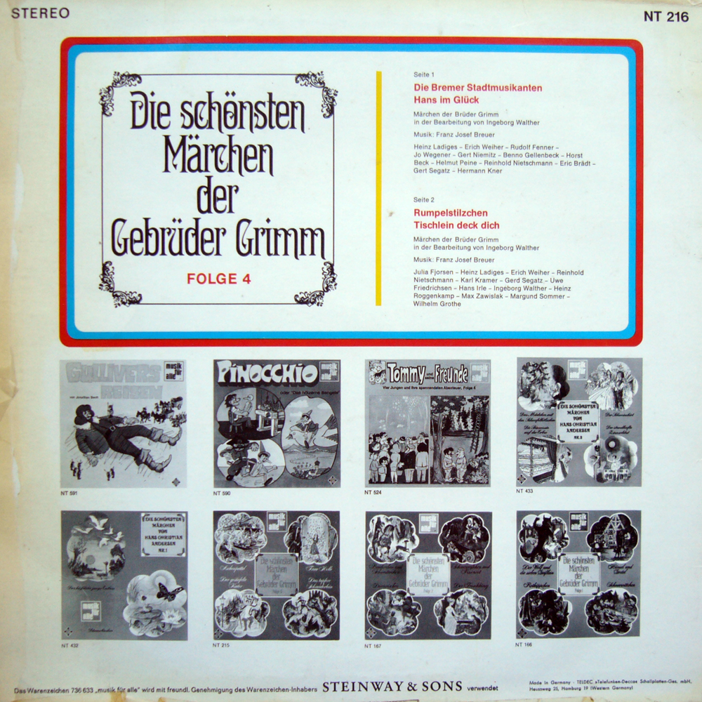 Mein besonderes Aha-Erlebnis auf dieser Platte hatte ich mit dem singenden Horst Beck in der Rolle des "Hans im Glück". Auch klingt er da noch nicht so alt wie bei den Europa-Produktionen - Kunststück, stammen die Telefunken-Aufnahmen ja immerhin schon original aus den 50ern und erschienen damals in der Serie (Das klingende Märchenbilderbuch) auf Singles.