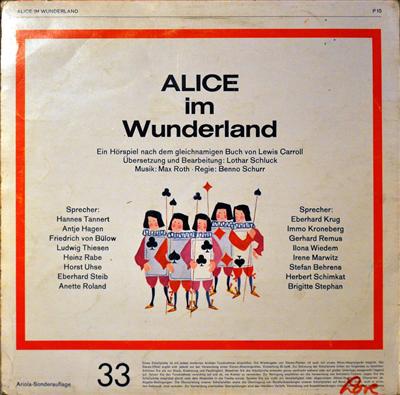 Ariola, Baccarola, Opera: Die Benno-Schurr-Fassung von "Alice" ist in vielen Auflagen erschienen. Lothar Schlucks Textfassung ist - trotz aller unvermeidlichen Unübersetzbarkeiten und Auslassungen - sehr sorgfältig und subtil ironisch.