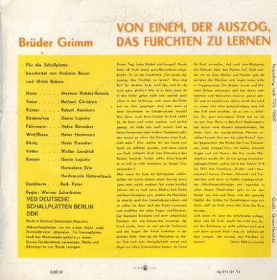 Aber bevor Ihr Euch die Schallplatte anhört, wollen wir zuerst einmal einen Sprung ganz, ganz weit zurück machen! Vor vielen hundert Jahren, als es noch keine Bücher, kein Radio und kein Fernsehen gab, wollten die Menschen ja abends auch ihre Unterhaltung haben, und so saßen sie denn nach der Arbeit zusammen und erzählten die alten Sagen und Märchen. Der Kienspan knisterte und warf unheimliche Schatten, die wie Gespenster aussahen, der Hund jaulte, denn es war gerade Vollmond, und die Augen der Katze funkelten in der dunklen Ecke. Und da die Menschen zu dieser Zeit noch sehr abergläubisch waren und Angst vor allem Unheimlichen hatten, da könnt Ihr Euch vorstellen, daß auch dem Mutigsten ein Schauer über den Rücken lief. Doch später, als es dann Bücher und Theater gab, da gerieten die Märchen und Sagen immer mehr in Vergessenheit. Die Brüder Jacob und Wilhelm Grimm erkannten, daß hier etwas sehr Schönes und Wertvolles verloren gehen würde, und sie beschlossen daher, durch das Land zu reisen und alles aufzuschreiben, was sich das Volk noch erzählte, um es uns zu erhalten. Ein ganz besonderes Glück war es, als sie auf ihrer Reise in dem Dorf Niederzwehrn bei Kassel eine Bäuerin kennenlernten, die ihnen viele der wunderschönen Märchen erzählen konnte. Das war die ?alte Marie?. Später begegneten die Brüder der Frau Viehmännin, einer rüstigen Frau mit hellen, scharfen Augen und viel Humor, die ihre zweite Märchenfrau wurde. Als sie nun genug zusammengetragen hatten, gaben sie in den Jahren 1812 bis 1815 ihre Sammlung ?Kinder- und Hausmärchen? heraus. Zauber-, Schwank- und Tiermärchen sind darin zu finden, Lügengeschichten, Gleichniserzählungen und Legenden In allen diesen Geschichten geht es um den Kampf von Gut und Böse, und das gesunde Gefühl des Volkes für Gerechtigkeit zeigt sich darin, daß am Ende immer das Gute das Böse besiegt. Und wenn Ihr jetzt die Schallpiatte auflegt, dann rate ich Euch, macht das Licht aus, damit die Stimmung so recht geheimnisvoll wird und dann gruselt Euch ruhig ein bißchen mit dem Jungen, der auszog, das Fürchten zu lernen!