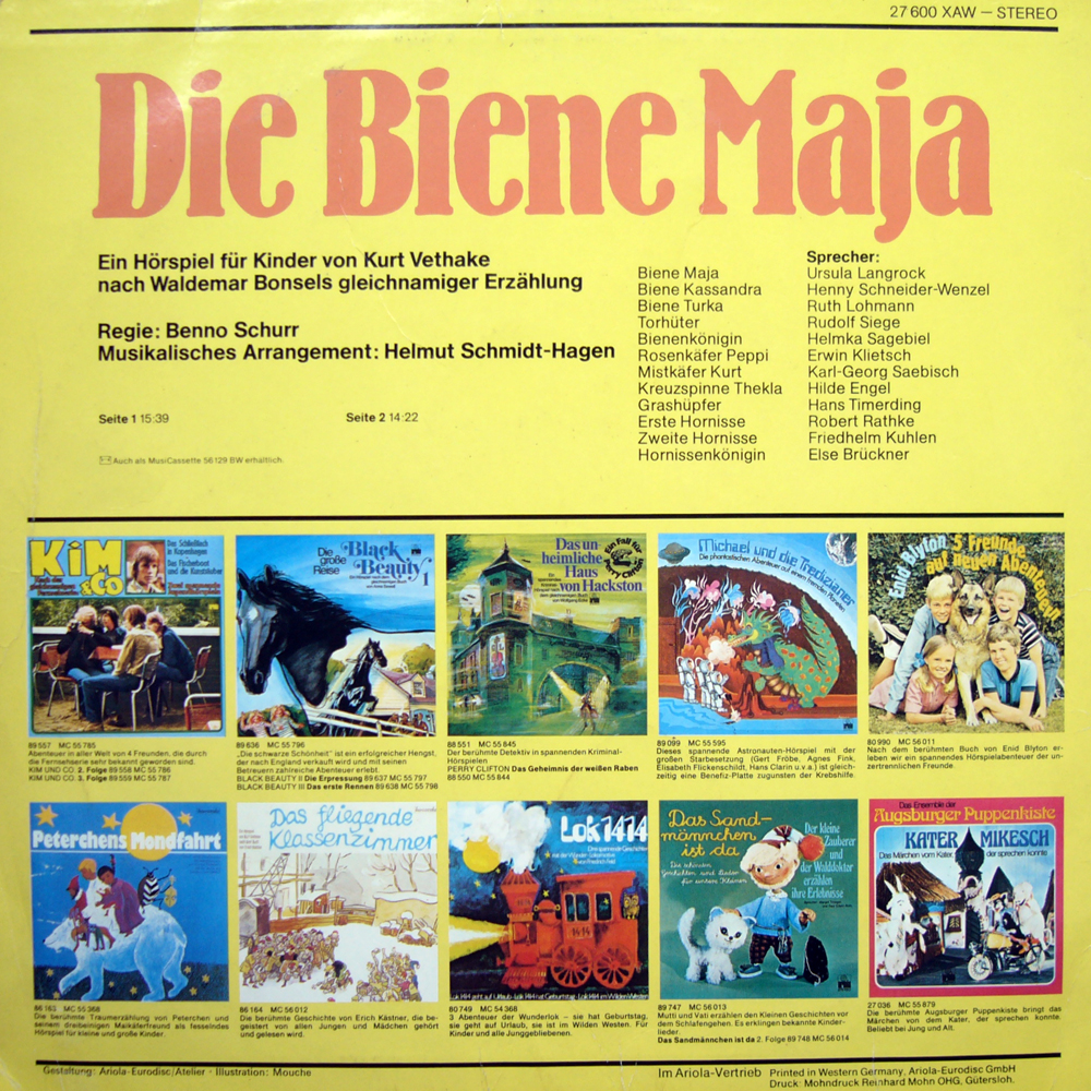 Dieses Hörspiel ist etwas für alle, die die literarische Vorlage von Waldemar Bonsels kennen oder gerne kennen lernen möchten. Kurt Vethake hat hier eine sehr schöne Kurzfassung dieses kleinen Romans geschrieben, die selbstverständlich um Klassen besser ist als das, was uns später via Fernsehen und Poly-Plattenserie geboten wurde. Die vorliegende Aufnahme stammt mit Sicherheit schon aus den frühen 60er Jahren und erschien zunächst noch auf einer 25-cm-LP, wurde aber dann ohne Veränderung auf 30-cm-LP und auch auf MC veröffentlicht. Angabewn zur Besetzung kann ich hier noch nicht machen, werden nachgeliefert.