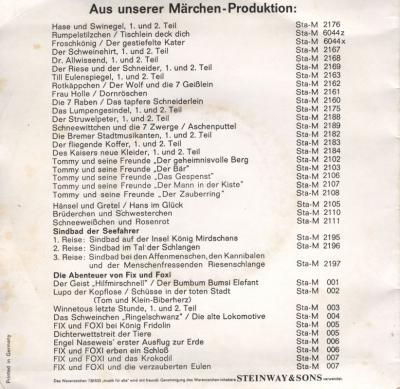 Zwei Hörspiele nach den Märchen der Gebrüder Grimm, gespielt und erzählt von Tante Ursula und ihren lustigen Zwergen [Seite A] bzw. Tante Ursula, den bösen Schwestern und den kleinen Tauben [Seite B], bearbeitet von Bert Enger.