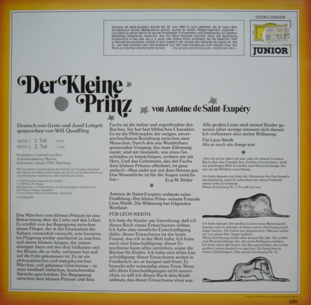 Ich bitte die Kinder um Verzeihung, daß ich dieses Buch einem Erwachsenen widme. Ich habe eine ernstliche Entschuldigung dafür: dieser Erwachsene ist der beste Freund, den ich der Welt habe. Ich habe noch eine Entschuldigung: dieser Erwachsene kann alles verstehen, sogar für die Bücher für Kinder. Ich habe eine dritte Entschuldigung