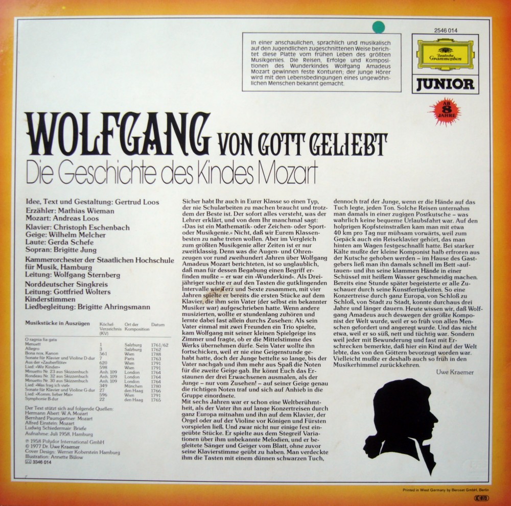 "In einer anschaulichen, sprachlich und musikalisch auf den Jugendlichen zugeschnittenen Weise berichtet diese Platte vom frühen Leben des größten Musikgenies. Die Reisen, Erfolge und Kompositionen des Wunderkindes Wolfgang Amadeus Mozart gewinnen feste Konturen