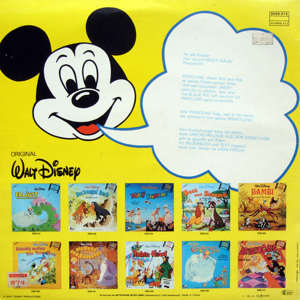 Herrlich! Ganz viele Filmszenen, so wie sie sich dem deutschen Publikum bis in die 70er Jahre präsentierten. Dann kam die neue deutsche Synchronisation und damit war der Ofen für diesen Film aus. So kannman ein Meisterwerk verhunzen. Für alle, die noch einmal in Erinnerungen schwelgen möchten und für alle, die den Pinocchio so hören möchten, wie er passgenau am englischen Original übersetzt wurde, für die ist diese LP ein Muss!