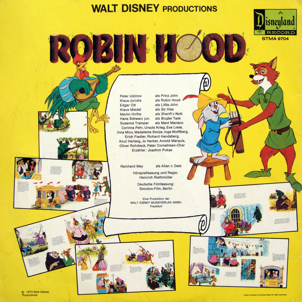 Hörspiel mit Dialogen und Musik aus der deutschen Filmfassung. Da der Film in Berlin synchronisiert wurde, gibt es viele Sprecher zu hören, die auch z.B. beim Dschungelbuch mitwirkten. So z.B. Edgar Ott (= Balu) als Little John. Eine Besonderheit ist Peter Ustinov als Prinz John (den er wohl auch in der amerikanischen Originalfassung gesprochen hat). Und witzig: Oliver Rohrbeck ganz ganz jung. Die Lieder singt Reinhard Mey.
