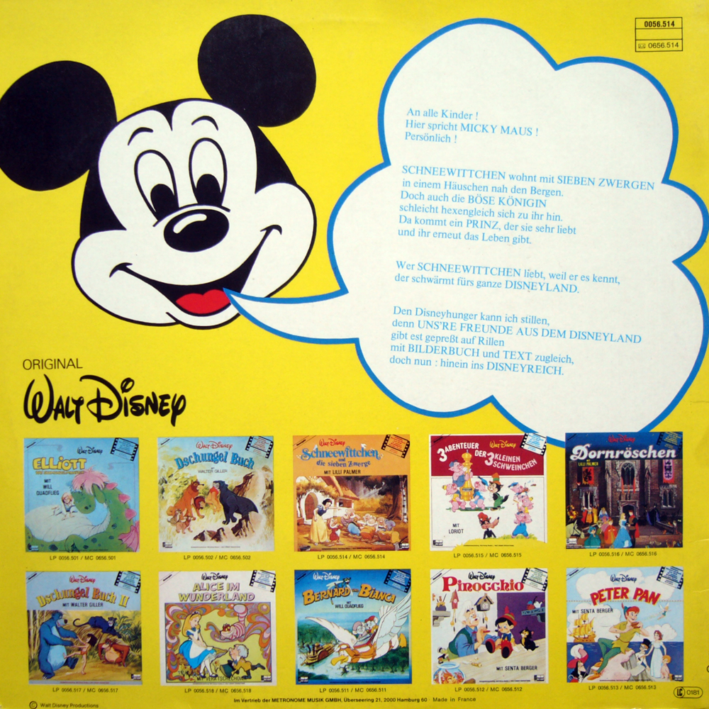 Ansonsten verweise ich bezüglich der Zauberspiegel-Ausgabe (hier fälschlich als Erstauflage gekennzeichnet) und der vermeintlichen Neuauflage (dies ist ein schlechtes REMAKE mit Nichtoriginalstimmen !) mit Lilli Palmer als Erzählerin auf meinen Eintrag bei der originalen Schneewittchen-LP von Disneyland (hier gekennzeichnt "mit Buch 10S").